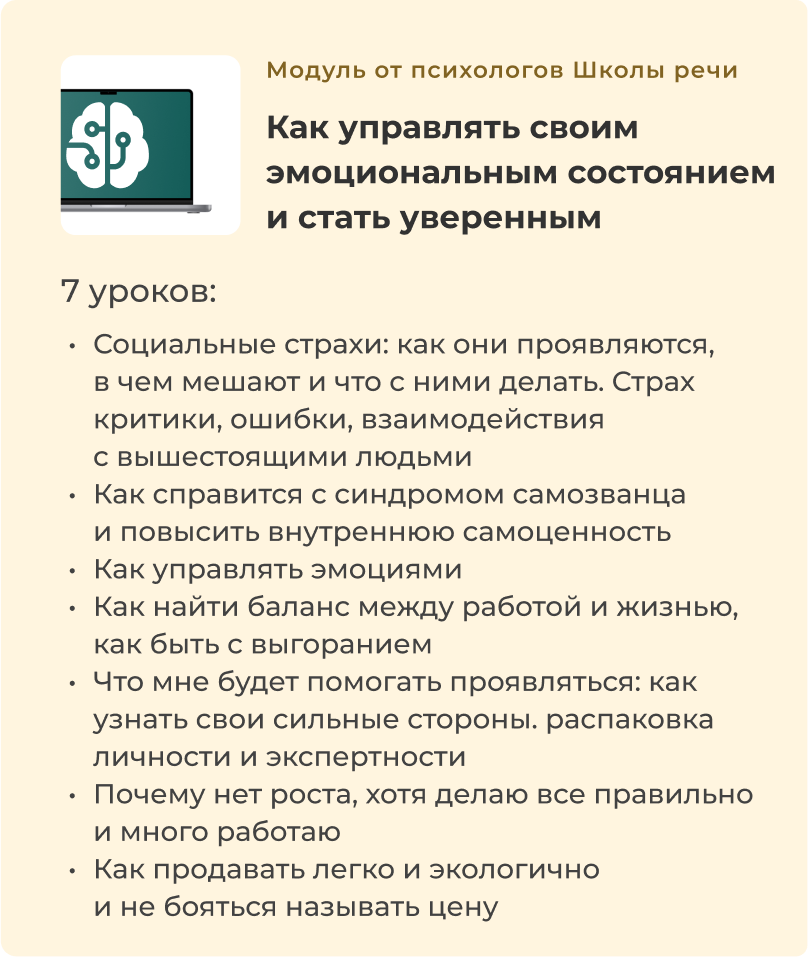 ● Бонус. Модуль от психологов Школы речи «Как управлять своим эмоциональным состоянием и стать уверенным» (7 уроков)